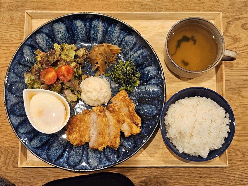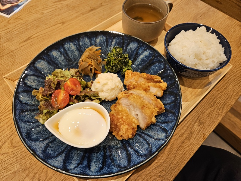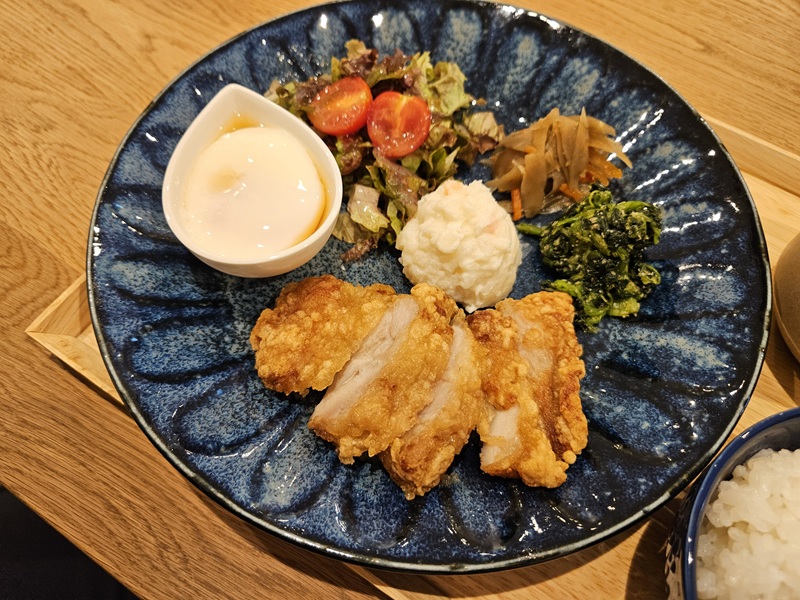 では、メインの鶏の竜田揚げを頂きます。パクリ。美味しい!!!鶏がとてもジューシーで下味がしっかりしていて美味しい!プレートの野菜やお惣菜は地元の食材。美味しくて健康的です!