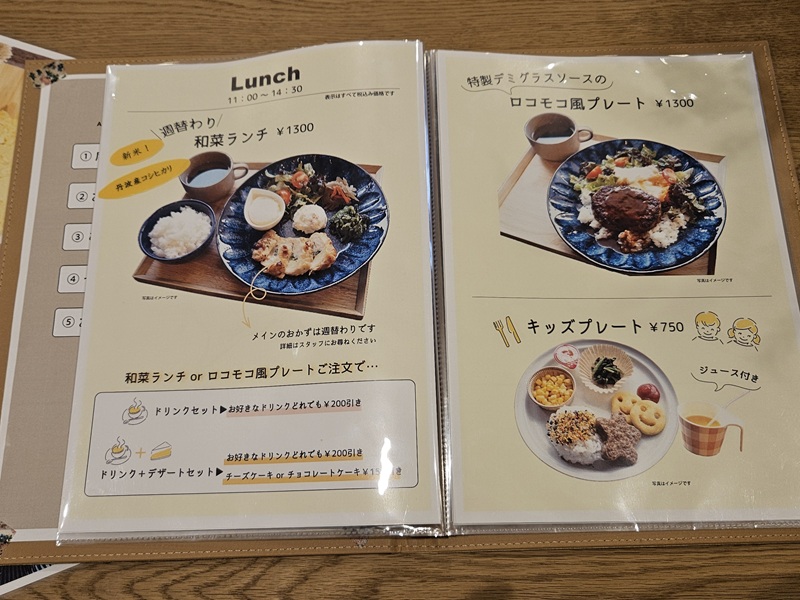 メニューを見ます。ランチは2種類。和菜ランチかロコモコ風プレート。キッズ向けもありますね☆スイーツも充実しています(^^)。和菜ランチに決めました!