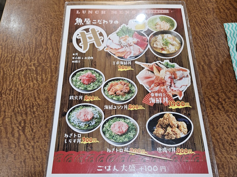 メニューを見ると定食もありますが、海鮮系の口になってしまったので、海鮮丼系のメニュー見ます。シンプルに「王道海鮮丼」にしました。