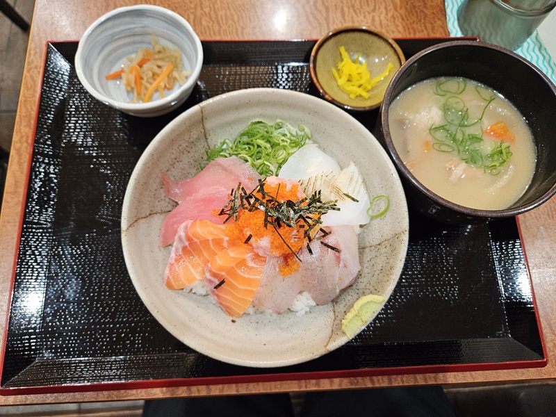 海鮮丼を味わいながら完食!熱々の豚汁と新鮮な海鮮丼に身も心も癒されて大満足です☆