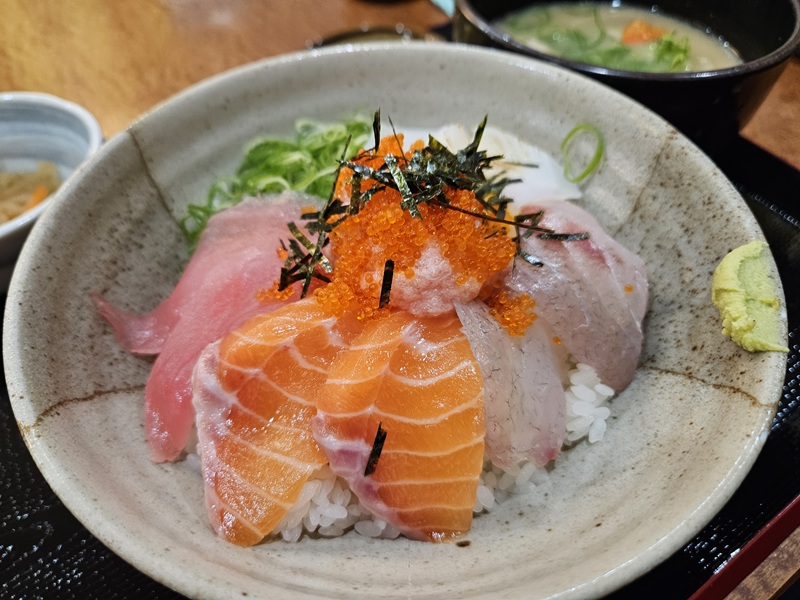 では、わさび醤油をつくって、海鮮にかけて頂きます!サーモンからいきます、ご飯と一緒にパクリ。美味しい~。トロトロのサーモンだぁ!いろんな新鮮なネタを味わいながら海鮮丼を頂きます。