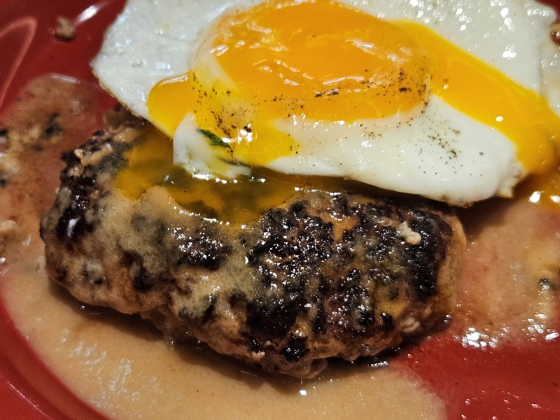 では、目玉焼きの黄身をわって。とろ~と来ました☆ハンバーグをパクリ、うーん!!!旨い!ガーリックソースのパンチ、とろとろ黄身のまろやかな味わいが良い具合にマッチして美味しいです!(^^)