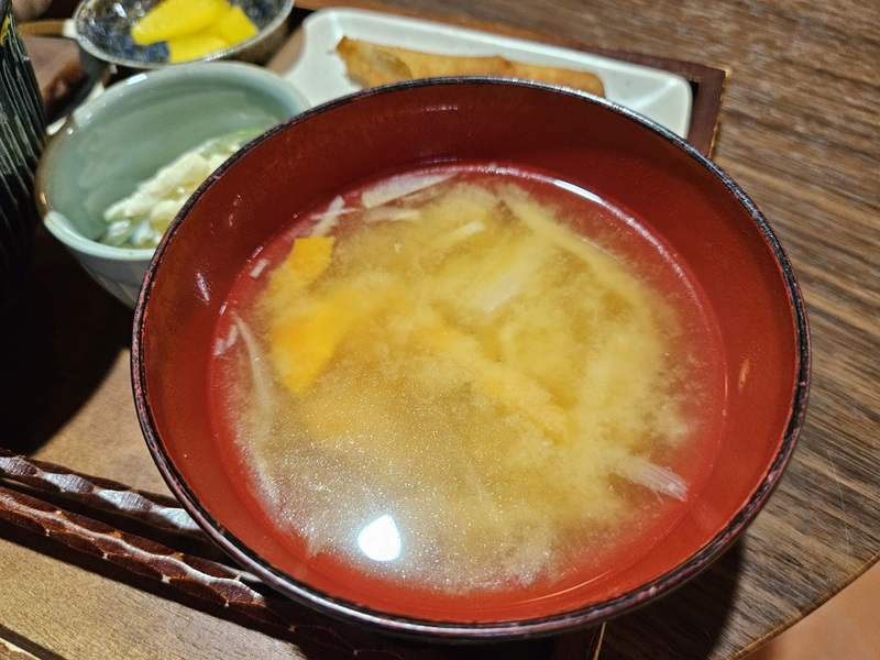 まずはお味噌汁を頂きます。ズズ。暖かくて美味しい(^^)。大根、ニンジン、ゴボウ、カボチャを根菜類で素朴な甘みのある味です。お美味しいです☆