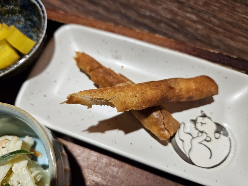細長いのは春巻きです。パリッとしていて美味しいです。塩加減がちょうどいい。