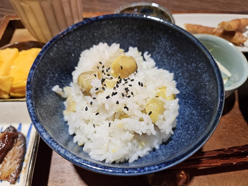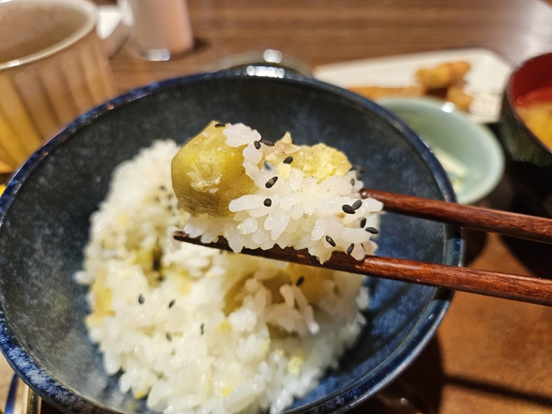 箸で栗をONしたご飯をパクリ。うーん!美味しい!!!ホクホクしていて、丹波栗特有の濃厚な甘さに感激です!その甘さがご飯にも沁みていて美味しい!他のおかずとの相性が抜群の味です(^^)