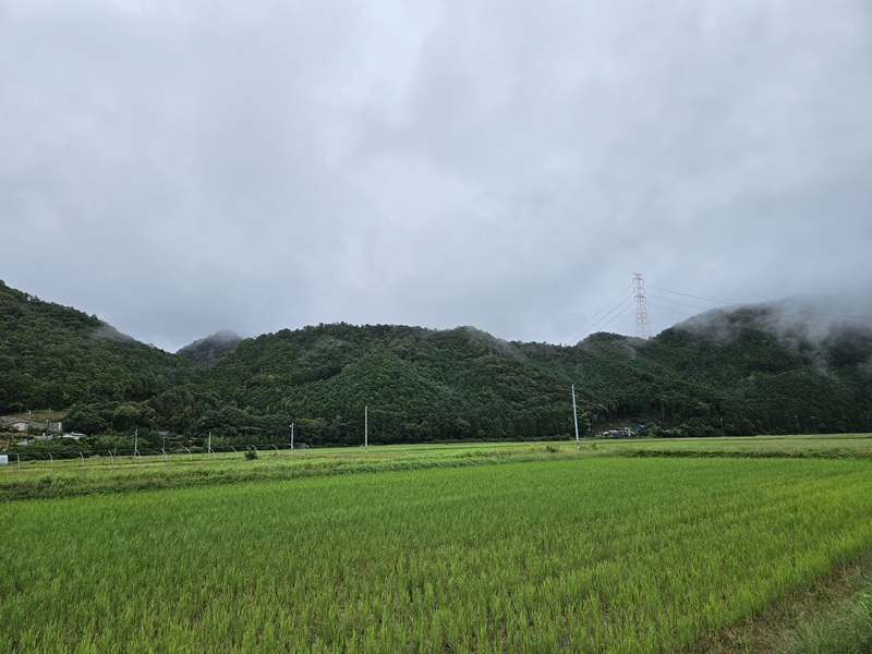 今日は雨、道路横から見た山並みと田園風景が幻想的です。