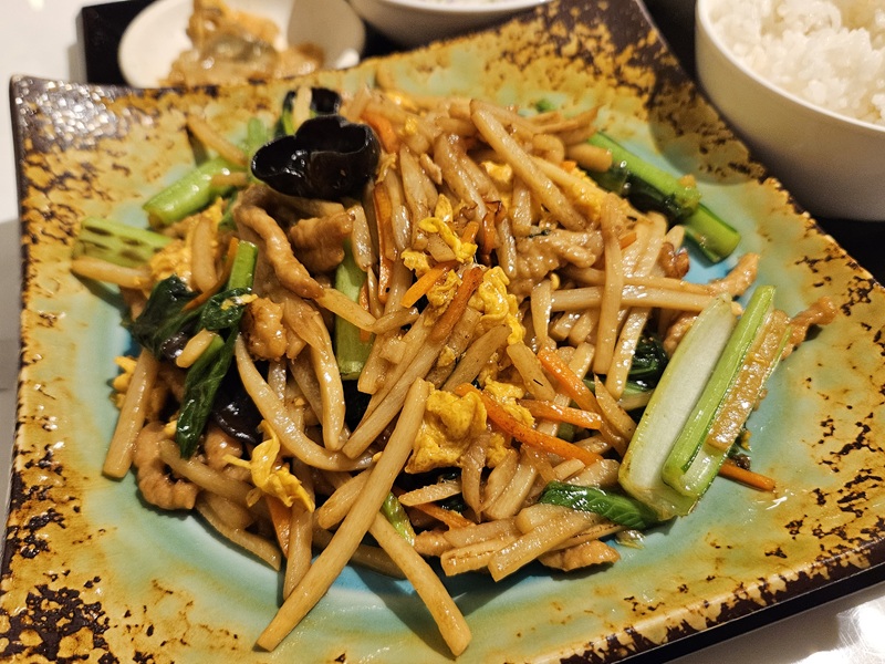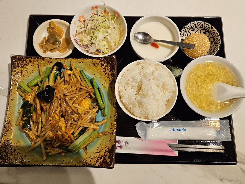 女性スタッフに案内されテーブル席に座ります。メニューを見て、キクラゲ玉子豚肉の炒め定食が美味しそうだったので、これに決まり!キクラゲ玉子豚肉の炒め定食を注文しました。