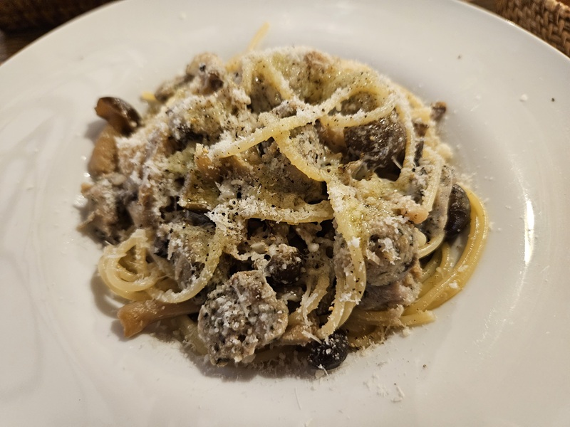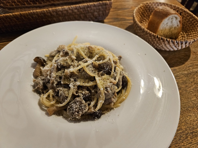 では、木の子とソーセージのチーズスパゲッティを頂きます。フォークで木の子を巻き込んでクルクルスパゲッティ巻いてパクリ。美味しい!!!木の子の旨味がとても美味しいです!そしてチーズが抜群。