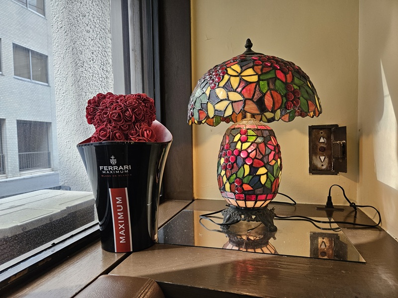 ふと横に目を向けると、おしゃれなステンドグラスのテーブル照明。ビルの中だけど、非日常を感じられる空間です(^^)
