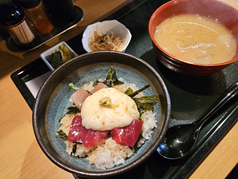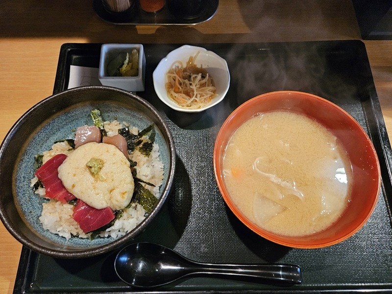 一人なのでカウンターに案内されて着席。豚汁のつく日替わりランチ「本まぐろ山かけ丼」を注文しました