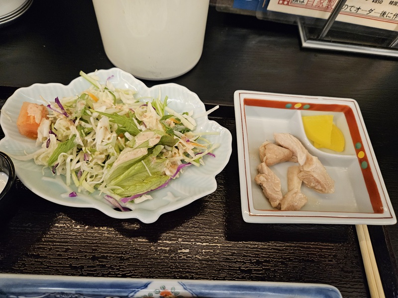 サラダは、ごまドレッシングが美味しいです!蒸し鶏もプリプリで塩味が染みていて美味しいです☆