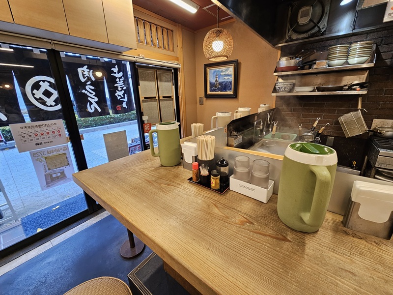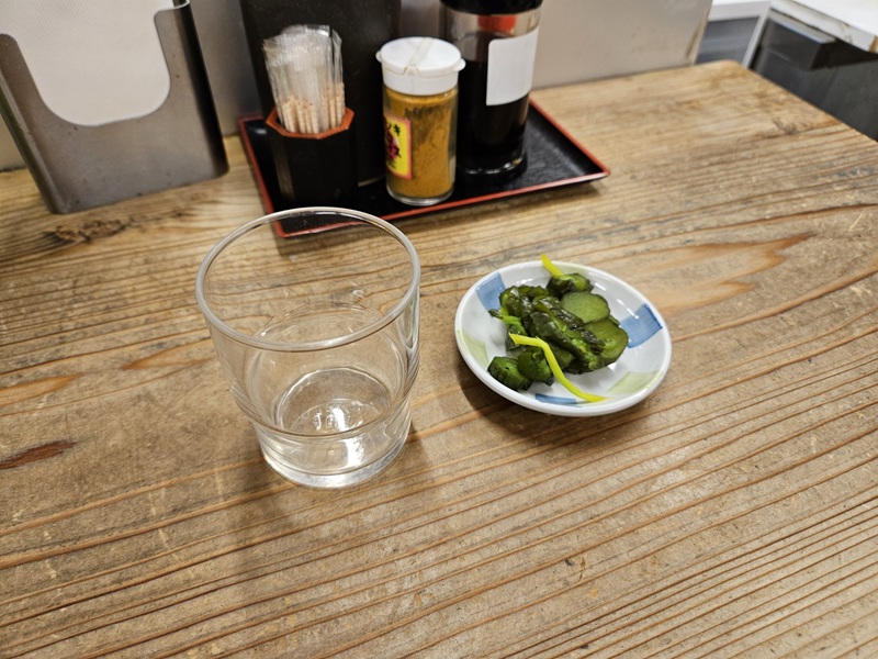 券売機蕎麦のカウンターに座り食券を渡します。コップと漬物が出てきました。