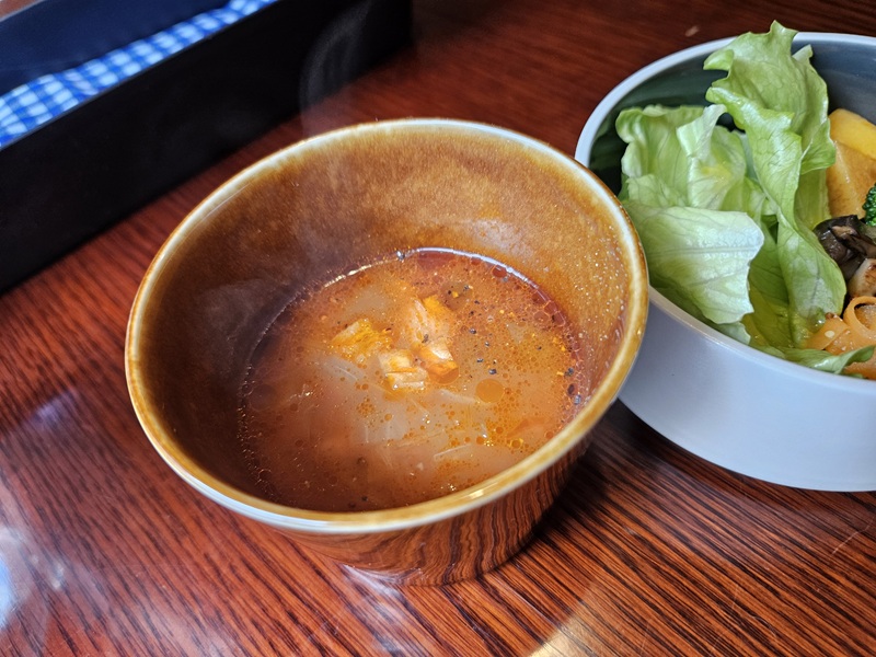 セットのスープとサラダがきました。スープを頂きます。ズズ。温かくてまろやかなトマトスープです。美味しい(^^)