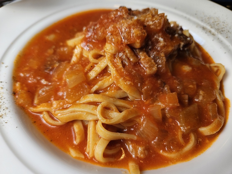 では、頂きます!フォークで生パスタをソースに絡めながらクルクルまいてパクリ。うん、美味しい!!!豚肉塩漬の塩味と旨み、トマトソースの旨味、チーズのコク、唐辛子の辛みが絶妙なコラボレーションで美味しいです!