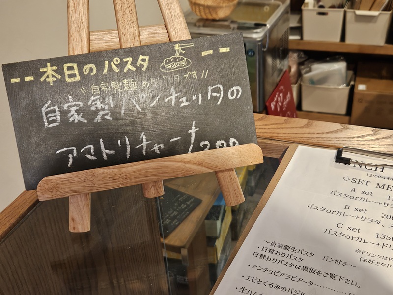 カウンターでランチを注文します。本日のパスタ、自家製生パスタ 自家製パンチェッタのアマトリチャーナとサラダとスープのセットを注文しました。パスタは他にも種類があります。あとは、カレー、サンドイッチ類があります。
