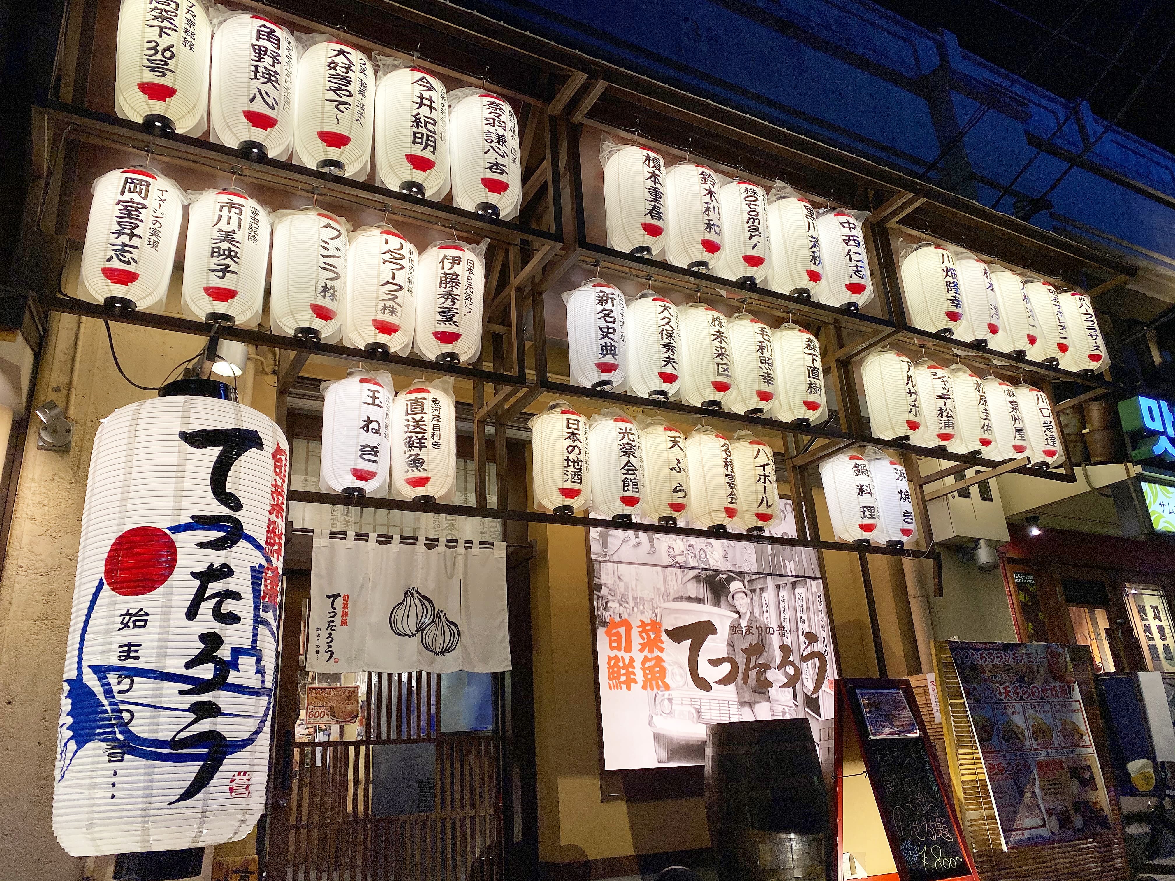 みんなで茶屋町の事務所を出て「てつたろう 梅田中崎町店」さんに向かいました。到着すると、たくさんの提灯で明るい入口です!